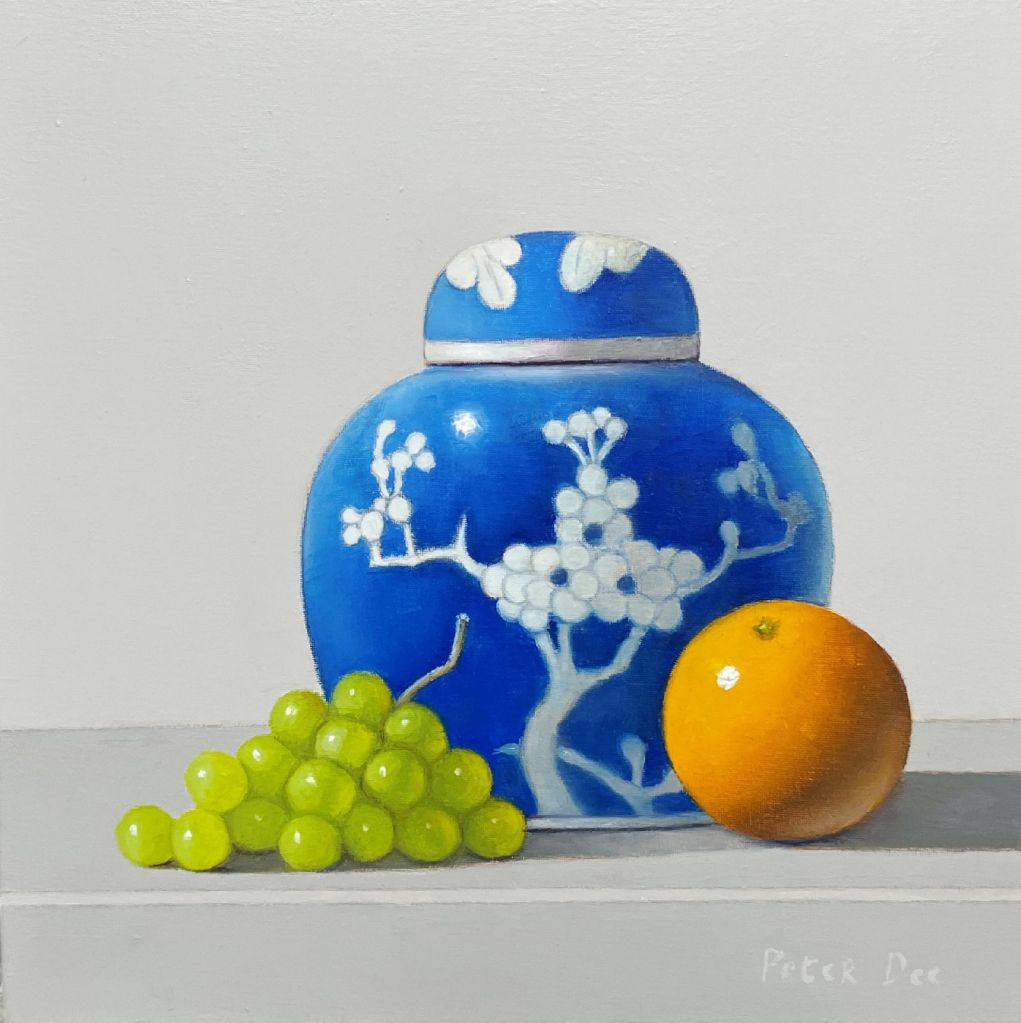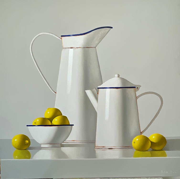 Still Life is the main subject matter on which Peter has concentrated. In the tradition of still life painting, he paints all his subjects from life, using only natural light. This light transforms simple objects in Peter’s still life compositions into visually exciting images full of vibrant colour combinations. He strives to capture the effects of light as it affects various surfaces on objects such as fruit, enamelware, earthenware bottles, etc. He conveys a sense of drama in his paintings by the arrangement of the objects and their relationship to the space around them.